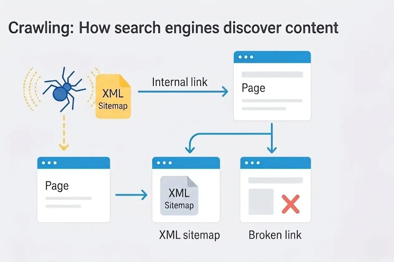 Crawling is how Google discovers and reads your website. Google sends out an automated bot called Googlebot that travels across the web by following links from one page to another. When Googlebot visits your page, it reads everything on it including your text, images, links, and code, so it can understand what the page is about. If your website has a slow server, broken links, or a misconfigured robots.txt file, Googlebot may struggle to access your content or skip it entirely. Google also works within a crawl budget, meaning it only crawls a limited number of pages on your site per day. If your site is filled with low-value or duplicate pages, your important pages may get crawled less frequently.